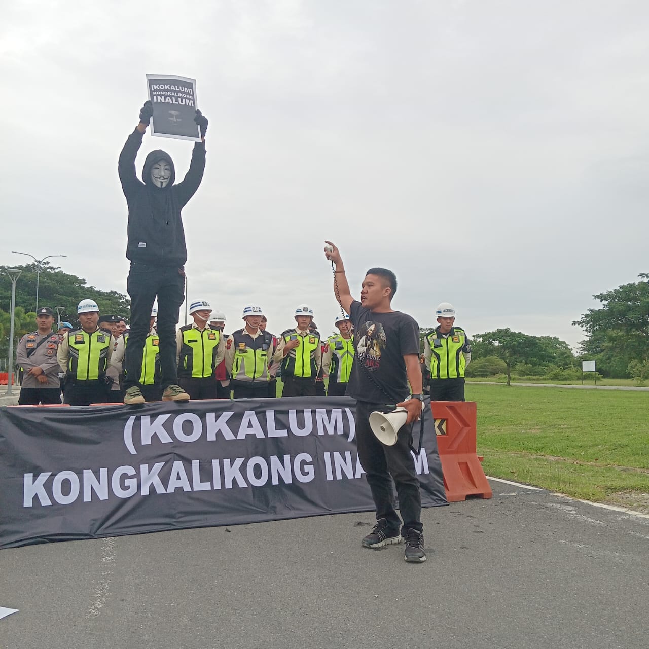 Dalam aksinya, pria mengenakan topeng Anonymus menamai dirinya sebagai Mr.K terlihat membawa sejumlah poster dan spanduk. Salah satu spanduk utama bertuliskan “KOKALUM (Kongkalikong Inalum)”.