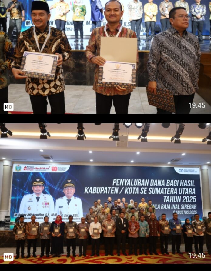 Dalam kesempatan itu, Pemerintah Kota Tanjungbalai menerima penyaluran Dana Bagi Hasil (DBH) dari Pemerintah Provinsi Sumatera Utara sebesar Rp 4.598.030.553 yang diserahkan langsung Gubernur Sumatera Utara, Bobby Nasution kepada Wali Kota Tanjungbalai Mahyaruddin Salim